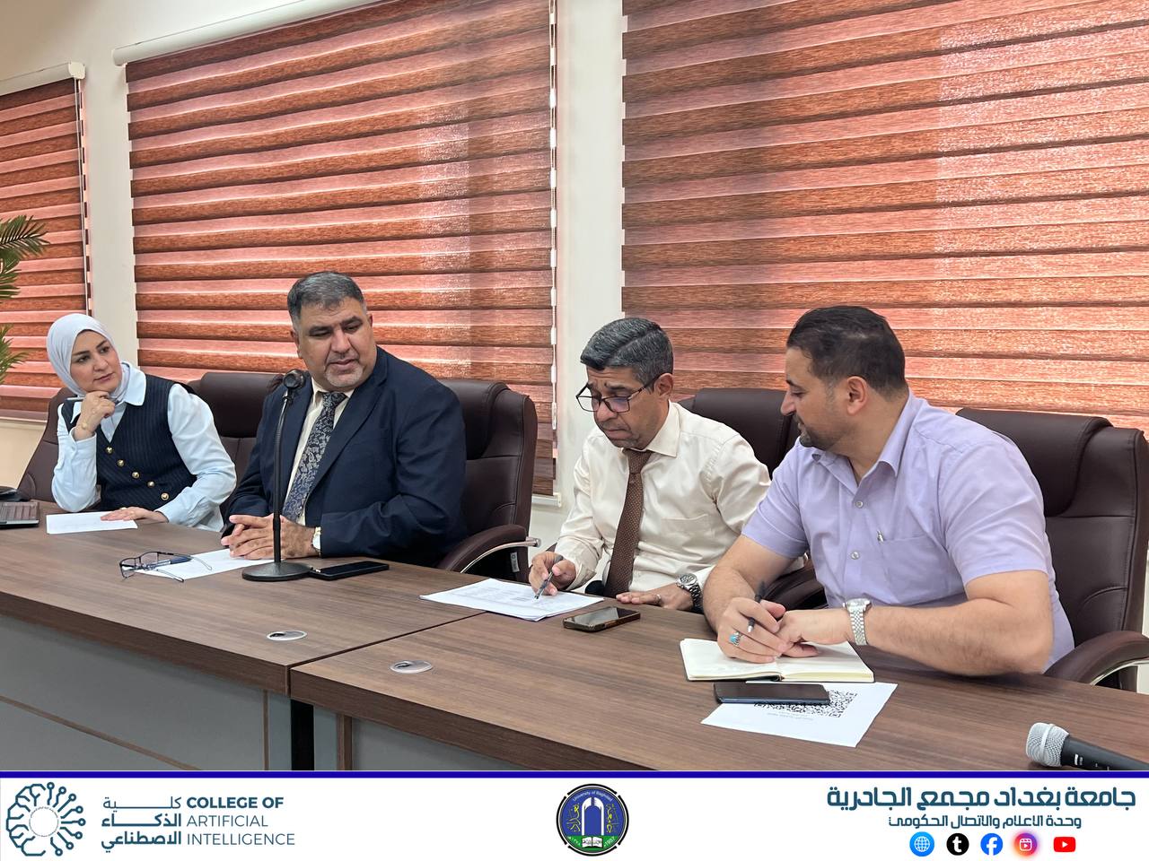 عقدت كلية الذكاء الاصطناعي في جامعة بغداد، اجتماعاً برئاسة عميد الكلية الاستاذ الدكتور ضياء جاسم كاظم، وبحضور معاون العميد ورؤساء الأقسام العلمية وأساتذة المرحلة الأولى، لمناقشة الجوانب العملية للمناهج الدراسية الخاصة بهذه المرحلة.