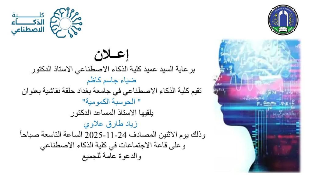 برعاية عميد كلية الذكاء الاصطناعي الاستاذ الدكتور ضياء جاسم كاظم تقيم كلية الذكاء الاصطناعي في جامعة بغداد ورشة عمل بعنوان “Quantum Computing ” “الحوسبة الكمومية”CoaiNovember 23, 2025